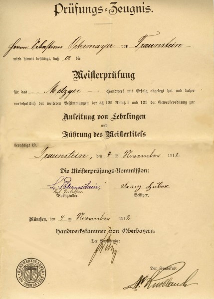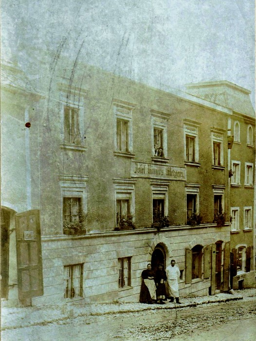 Sebastian Ostermayer Metzgermeister und Gastwirt, heiratet Walburga Amann und übernimmt um 1860 nach der Post den Wiesenwirt in Traunstein. Der aus dieser Ehe hervorgegangene Sohn wiederum ein Sebastian wurde am 27. Januar 1862 geboren. Dieser erlernte das Metzgerhandwerk in Freising bei Josef Tremmel, Metzgermeister und Koch, was ein Zeugnis aus dem Jahre 1878 errät. Seine zukünftige Ehefrau war Regina Tremmel geb. am 24. Juli 1854 die Tochter des ehemaligen Lehrmeisters Josef Tremmel und seiner Frau Rosina Tremmel. Regina und Sebastian heirateten 1884.