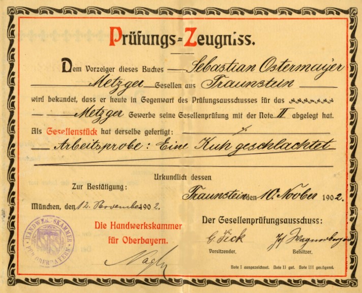 Sebastian Johann Nepumuk Ostermayer lernt in diesem Betrieb von 1899 bis 1902 das Metzgerhandwerk. Er ist es auch der den Betrieb weiter führte und die am 22.08.1993 geborene Helene Scherbl zur Frau nimmt.